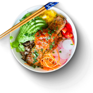 Arroz Japonês, Gergelim, Molho Ponzu, Peixe Branco Fresco, Edamame, Manga, Sunomono, Cebola Roxa e Crispy de Couve.